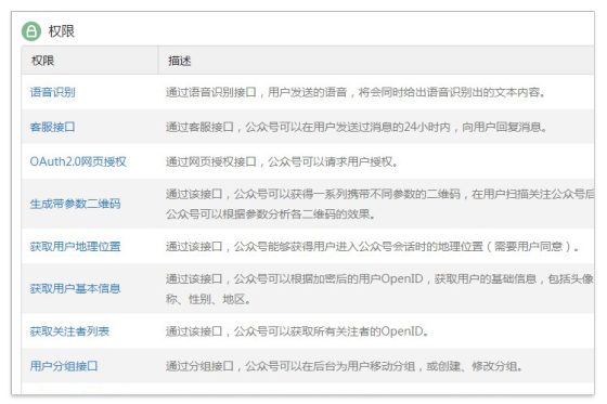 此次微信开放的高级接口权限包括:语音识别、客服接口、OAuth2.0网页授权、生成带参数二维码、获取用户地理位置、获取用户基本信息、获取关注者列表、用户分组接口等8项。