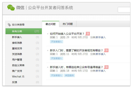 公众平台开发者问答系统主要用于开发者之间交流互助,开发者问答系统可以从高级功能的开发模式页进入,点击进入。
