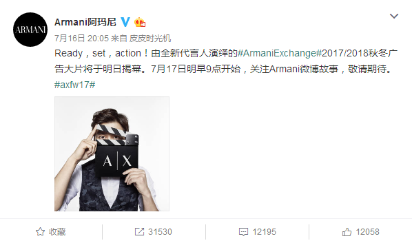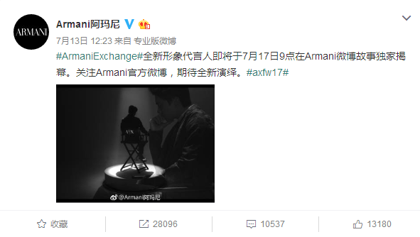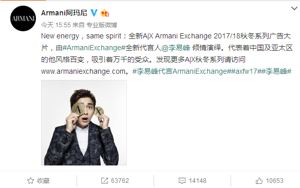 几个小时前,Armani通过官微正式宣布:由李易峰担任Armani Exchange 中国及亚太区形象代言人。