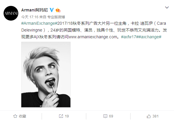 而随后,官微也公布了和wuli峰峰一起出演2017/2018秋冬广告大片的另外两位主角:世界第一DJ马丁·盖瑞斯和英国模特卡拉·迪瓦伊(Cara Delevingne)。