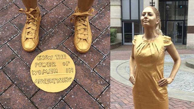德兰尼先将自己的衣服、鞋子和皮肤都涂成了金色,并请了一名化妆师帮助她完成妆容,然后她就站在麦肯纽约广告公司外,模仿起了“无畏女孩”的造型。