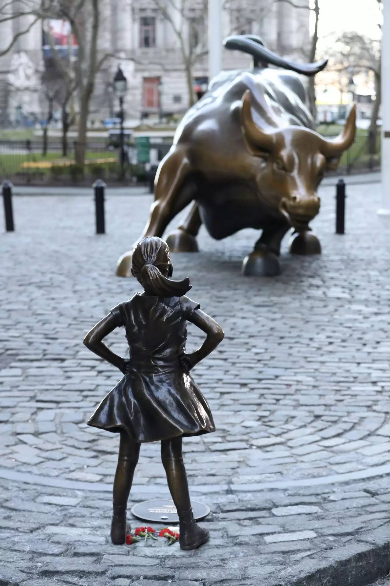 这个女孩由艺术家克里斯汀·维斯巴尔创作,因为被放置在了象征资本和财富的公牛对面,而被赋予了更多的内涵,比如性别、种族、挑战权威等等,还被很多人视为女权永不低头的象征。