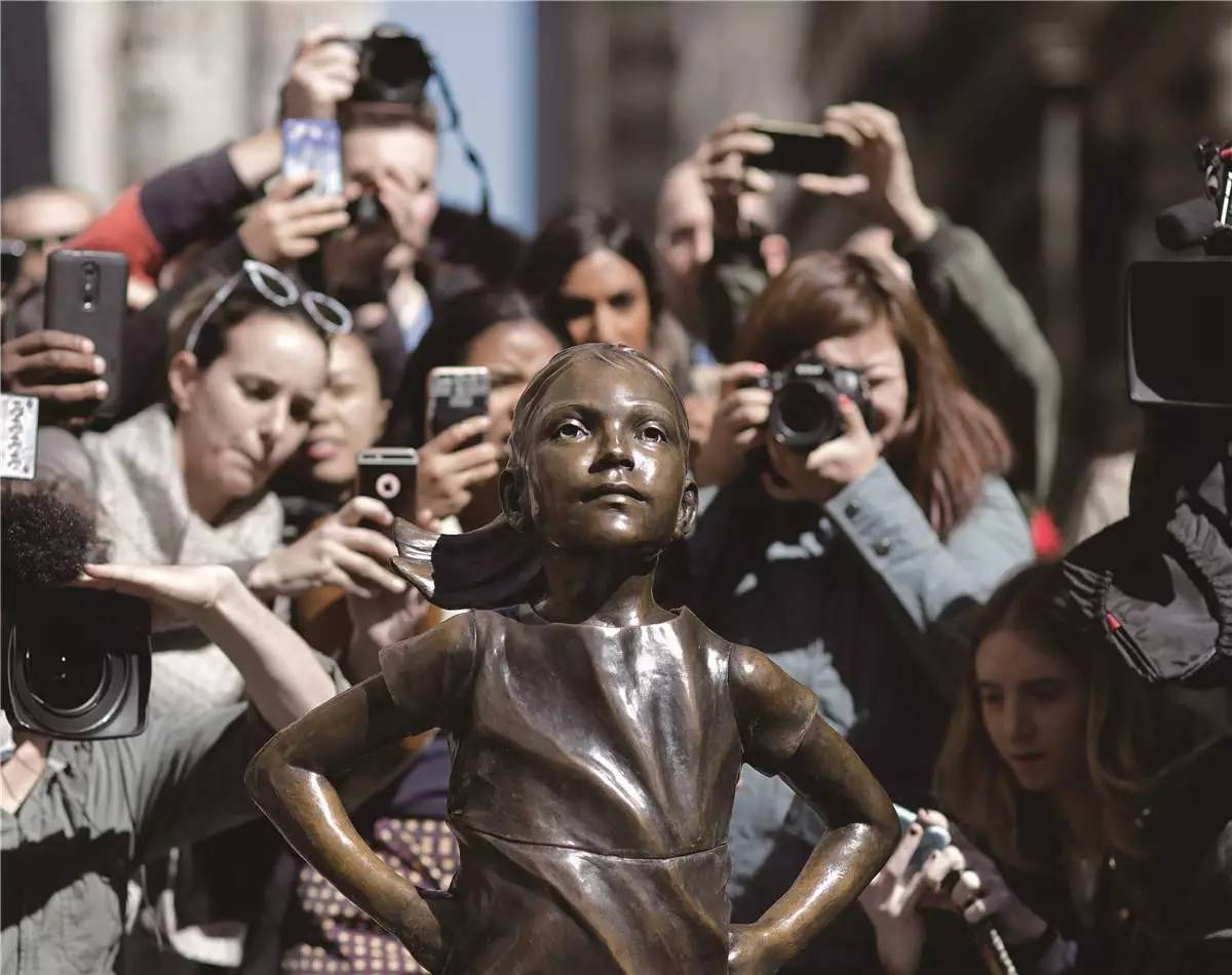 2017年三八国际妇女节,这座真正的“无畏女孩”铜像出现在华尔街铜牛的对面,这是麦肯纽约广告公司为道富环球投资管理公司(以下简称道富环球)做的一个广告,初衷是呼吁华尔街提供更多的女性职位。
