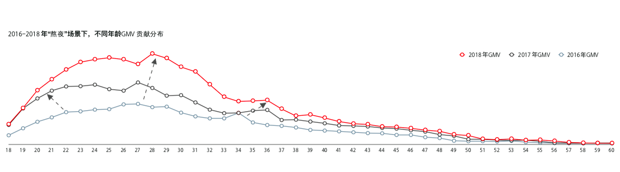 除此,“熬夜爆肝”则是信息过载和失控焦虑时代背景下的典型场景。“始于眼,兼顾脸,扩展全身”的美妆精细化需求,正在围绕熬夜场景高速崛起。同时,分年龄观察“熬夜”场景成交额贡献,阿里妈妈营销研究中心也发现“时代的焦虑”在向相对低龄(18-22 岁)和高龄(35-39 岁)的两端蔓延,市场规模和消费者生命周期在持续增长。