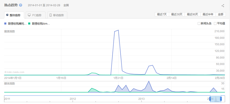 但从两桩收购案的百度指数变化趋势可明显看出,二者因过于接近而相互影响明显,加上春节假期影响,节后虽无任何刻意宣传,但翘尾效应明显。这也提示联想,虽然此次临近春节发布信息引发了相当量的关注,但重大发布会还是避开节假日为妙。