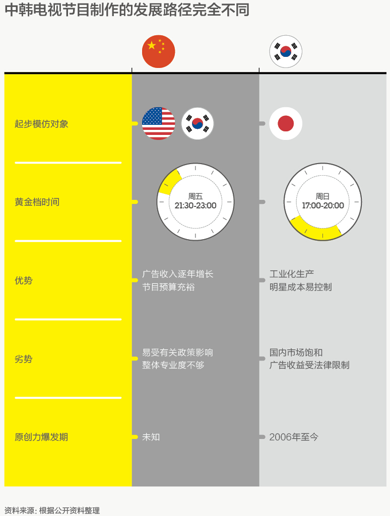 在韩国国内,综艺节目已经从辉煌走到瓶颈期。和现在的中国同行类似,20年前,韩国电视业模仿的对象是欧美和日本。他们从欧美节目中习得流程概念,从日本节目里学会创意激发。三大电视台(MBC、KBS、SBS)的PD需要定期去日本观摩节目制作。大部分作家则是通过拜托朋友寄节目录影带的形式,在家揣摩日本节目的内容。