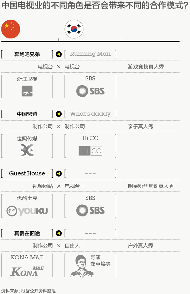 跟电视台的功能越来越像的视频网站也在向韩国电视台寻求合作。视频网站先是通过购买韩版节目播放权与韩国电视台建立联系,继而从渠道上溯到内容制作。面对国内综艺节目版权越来越高昂的价格,尝试着跟韩国电视台一起做一档节目,是件本小利大的事。