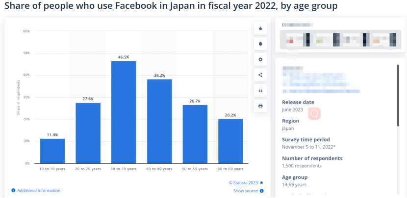 Facebook 在日本不同年龄用户间的覆盖度(2022 年)| 来源:statista7sGood
