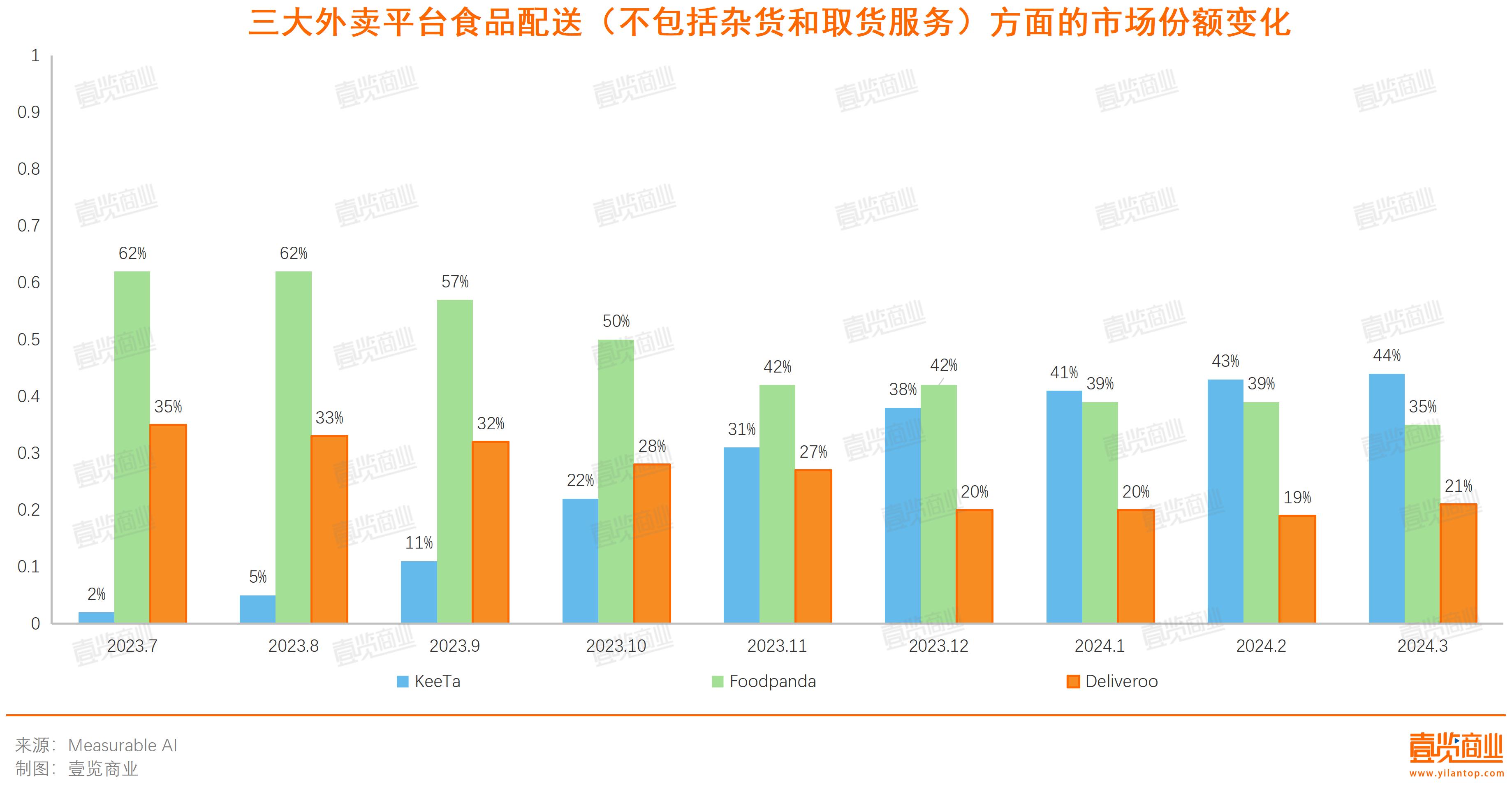 近日,Measurable AI发布了一组数据,按2024年一季度食品配送订单数量(不包括杂货和取货服务)来看,美团香港业务KeeTa的市占份额已达到44%,Foodpanda为35%,Deliveroo为21%,KeeTa成功跃升为香港第一大外卖平台。这距离美团进军香港市场不到一周年。