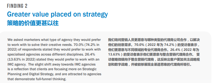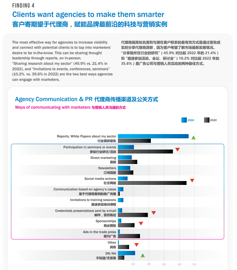 在经历了疫情阻断市场的几年后,面对日益激烈的市场竞争格局,市场主对市场营销趋势,消费者洞察,营销环境和工具等的变化,以及市场主所在品类行业分析等前沿性的研究需求急剧上升。相较于疫情前更为活跃的行业活动等,汲取有针对性的行业报告是市场主更关注的部分。这也成为了营销代理商吸引市场主的最有效的机会点。
