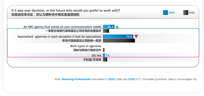 从与营销代理商的合作模式来看,与2年前相比较,与“整合营销代理商”的合作意愿翻倍增长,市场营销策略,尤其是数字化战略成为市场主关注的重点。在以追求短期营销效果和销售的基础上,品牌的可持续战略发展是突破市场竞争格局的长效驱动力。