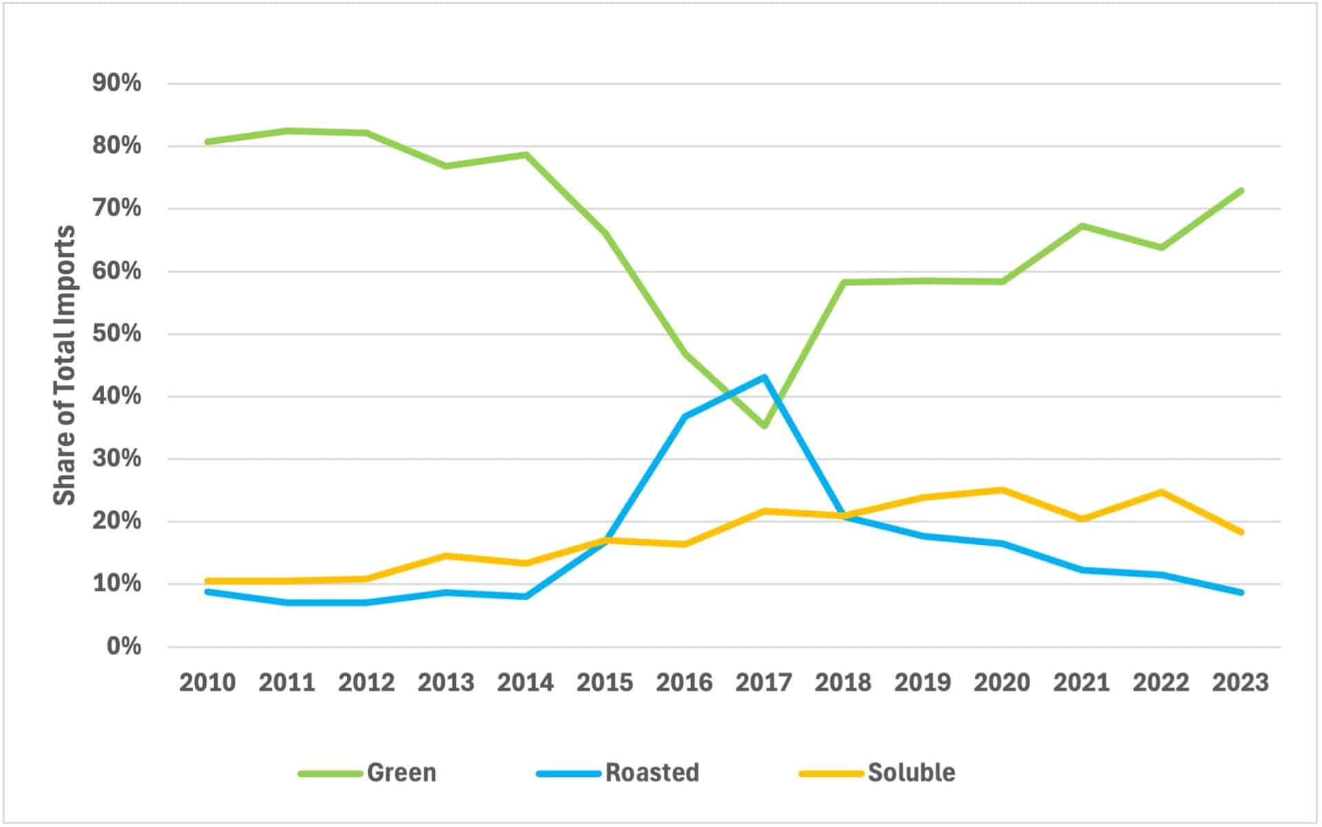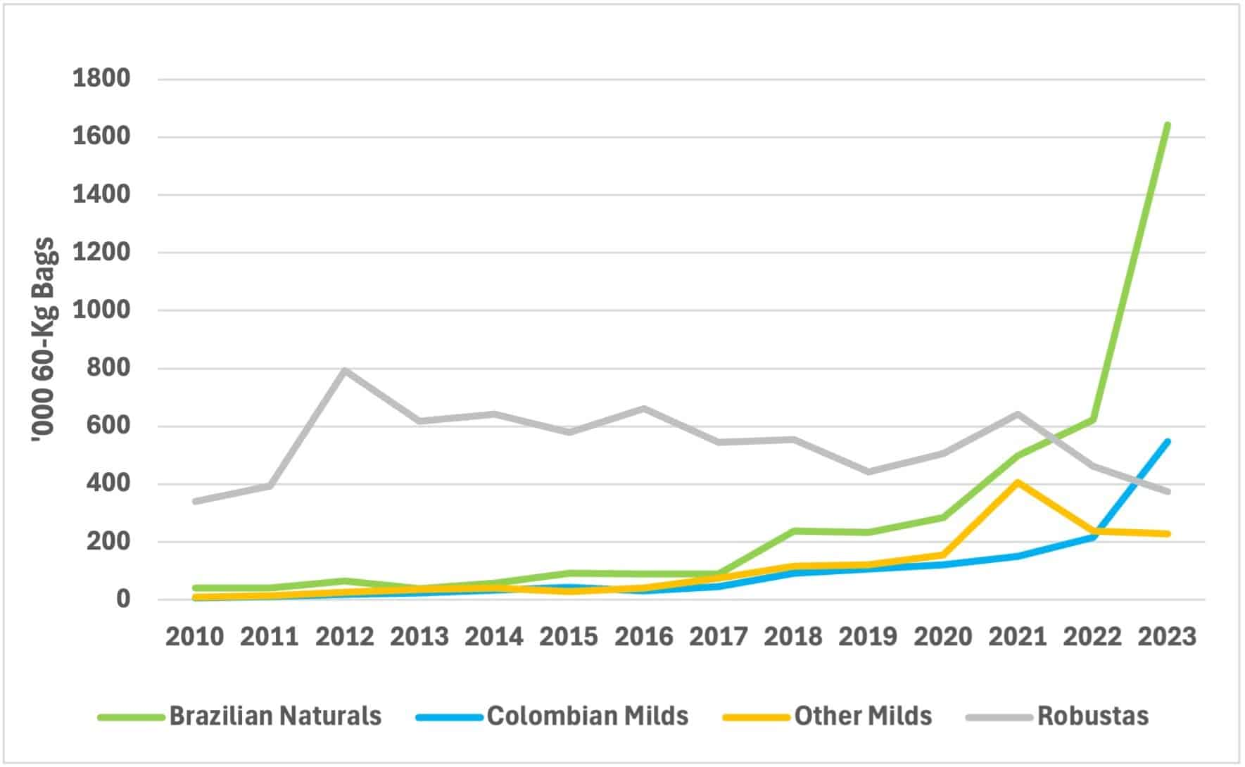 哥伦比亚的温和咖啡豆一直是主要来源,并仍然保持主导地位。从2010年到2023年,哥伦比亚温和咖啡豆的绝对进口量从不足1万袋增加到55万袋(60公斤袋)。