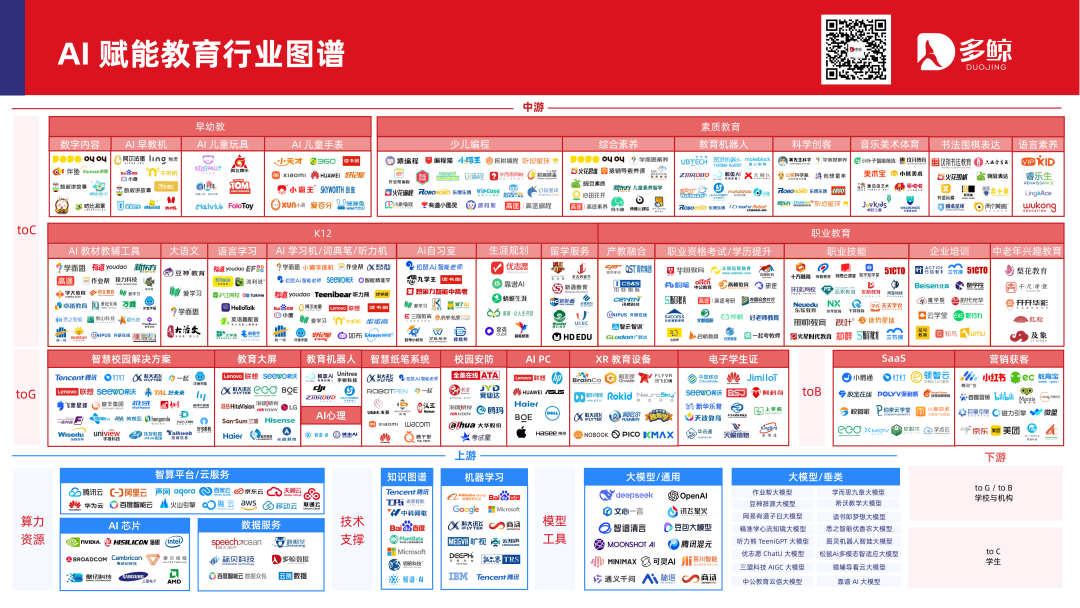 在早幼教、K12 教育、素质教育、职业教育、中老年兴趣教育等细分领域中,因行业基础、政策导向、AI 技术渗透程度不同等因素,格局仍有差异。
