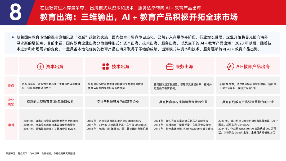 8.1 在线教育进入存量争夺, 出海模式从资本和技术、服务逐渐转向 AI + 教育产品出海