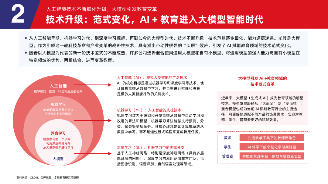 从人工智能早期、机器学习时代,到深度学习崛起,再到如今的大模型时代,技术不断升级,技术范畴逐步细化、能力逐层递进。尤其是大模型,作为引领这一轮科技革命和产业变革的战略性技术,具有溢出带动性很强的「头雁」效应,引发了 AI 赋能教育领域的技术范式变化。