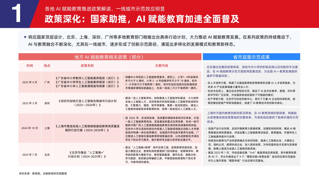 响应国家顶层设计,北京、上海、深圳、广州等多地教育部门相继出台具体行动计划,大力推动 AI 赋能教育发展。在系列政策的持续推动下,AI 与教育融合不断深化,尤其在一线城市,逐步形成了创新示范路径,涌现出多样化的发展模式和教育新样态。