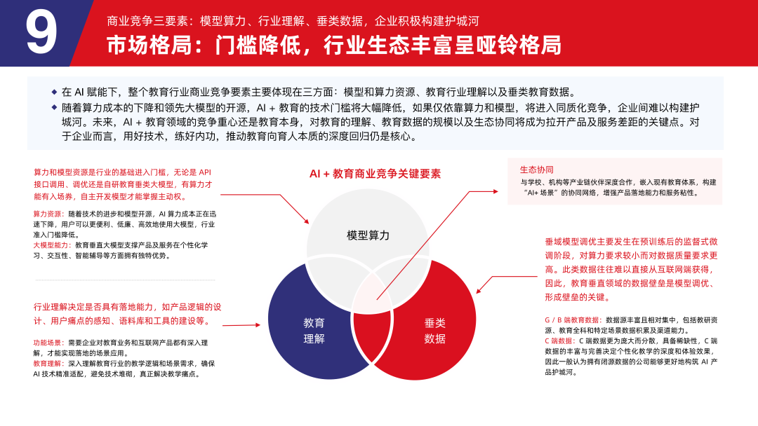 在 AI 赋能下,整个教育行业商业竞争要素主要体现在三方面:模型和算力资源、教育行业理解以及垂类教育数据。