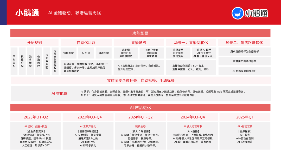 AI 赋能教企侧的运营场景,主要价值在于通过多样化的软硬件产品服务,帮助教企机构实现「招 - 教 - 研 - 学 - 管 - 评」全场景智能化升级。其中,以领智云、小鹅通等为代表的教育科技 SaaS 公司,已在教企侧构建起覆盖「营销 + 教学 + 管理 + 课程 + 评测 + 家校沟通」的全链路 AI 能力支持。