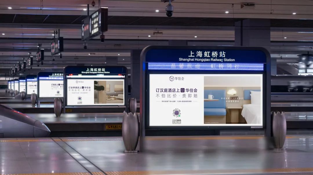 人流涌动的通道上,华住会旗下的汉庭、全季、花间堂等众多酒店品牌在广告大牌上集体亮相,宛如一次“云接机”“云接站”——“不怕比价,贵即赔”仿佛是为愉快旅行保驾护航的宣言。