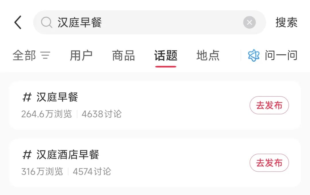 在查找用户关于连锁酒店的反馈时,惊蛰研究所意外发现,除了交通便利、价格便宜、住得好,作为国民酒店,汉庭店内提供的早餐竟然也成为消费者被种草的一大亮点。在小红书上,“汉庭早餐”相关的两个话题总浏览量达到了500万以上。