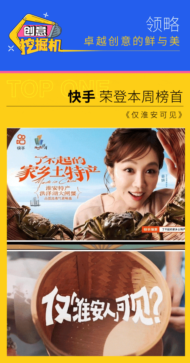 快手以优质内容打造「仅淮安可见」,宣传地产特产、扭转产地羞耻的现状,让消费者相信了下沉市场里的产品虽没有名气、但确实存在品质,不仅助力了洪泽大闸蟹的销量增长,也通过短片推动了洪泽文旅产业发展、城市形象建设。
