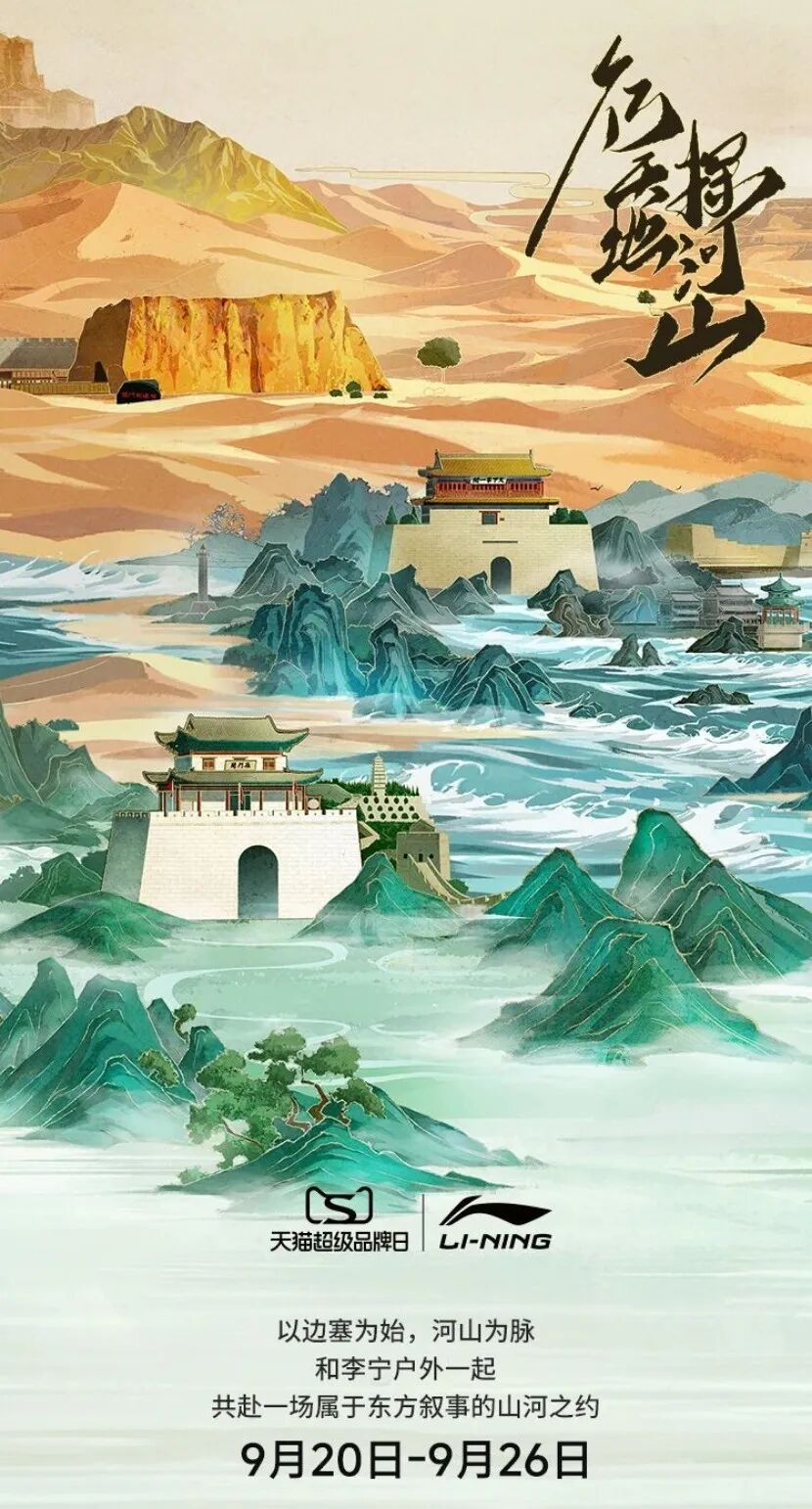 在这场运动品牌户外营销大考中,李宁以「多元场景+前沿科技+东方美学」的组合拳,强化了李宁户外产品在消费者心中的认知。一方面,李宁选择了年轻、口碑好、形象正能量的年轻演员,引发了消费者关注、形成品牌热度;另一方面,沙漠、山岭等场景的融入让户外产品变得具体可感。更值得肯定的是,李宁系列广告片以“行天地 探河山”的主题向消费者传递了李宁户外产品因其突出的品质可以陪消费者走遍祖国大好河山。