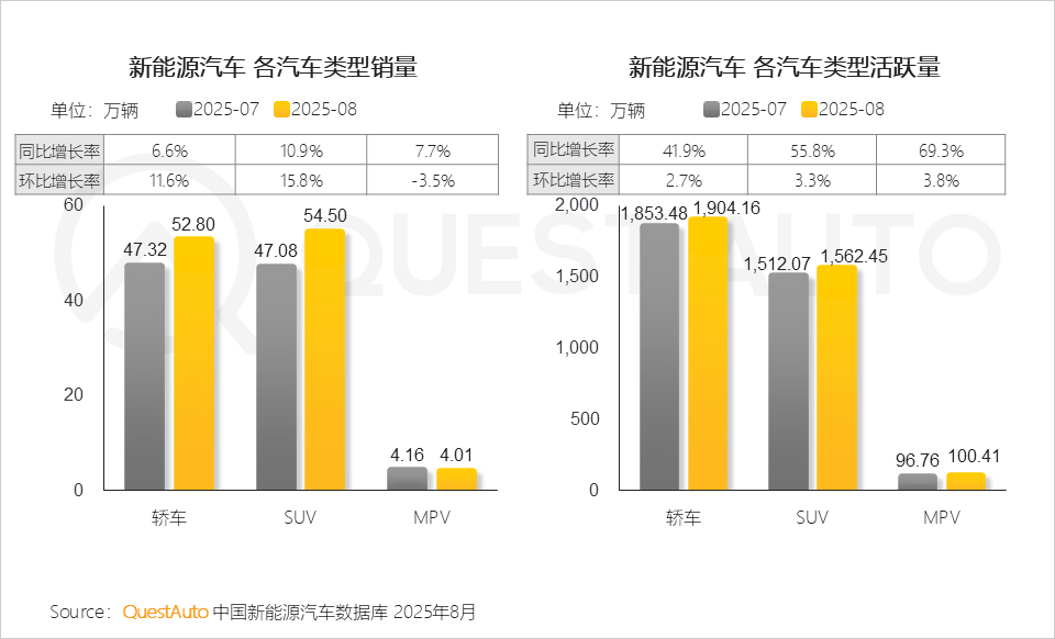 5、8月新能源汽车市场中, SUV销量以54.50万辆超越轿车;轿车、SUV销量和活跃量均实现同环比双增长的情况