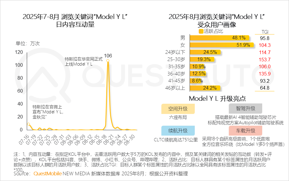 3、【Model Y L】特斯拉“冲击”纯电大六座SUV市场,通过“空间、续航、智驾”等核心升级引发市场关注,8月19日Model Y L正式上线首日拉升内容互动量达106万次