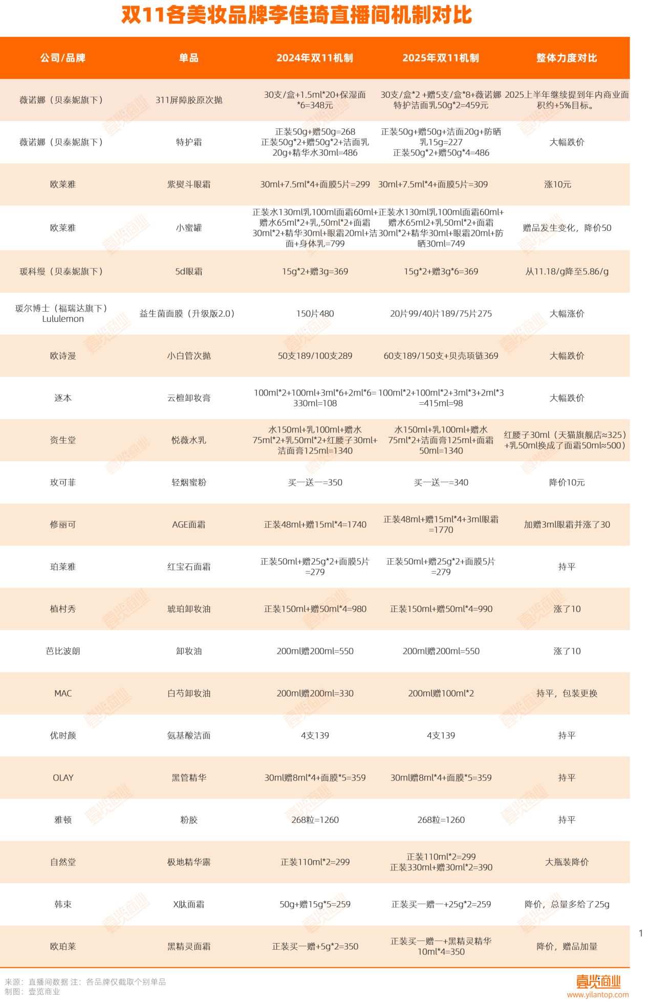 当然,通过这场秀,我们也可以捕捉到一些信息,比如面对李佳琦哪些品牌敢更强势,哪些品牌更弱势,而李佳琦到底在美妆领域的统治力还有多少。