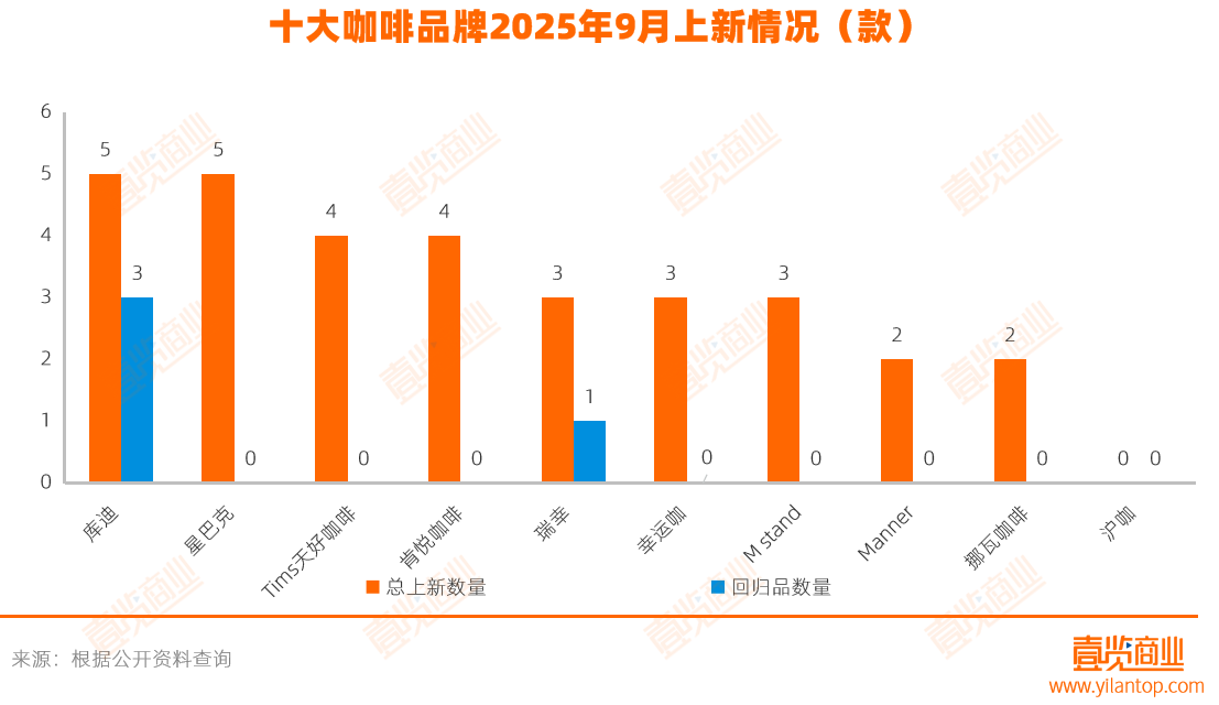 咖啡品牌中,库迪和星巴克上新最为活跃,各有5款新品上市;Tims天好咖啡与肯悦咖啡并列其后,分别推出4款新品。其他咖啡品牌在9月也保持了稳定的推新频率,上市2至3款不等。