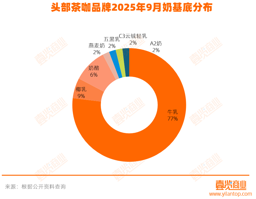 从奶基底看,牛乳仍然是经典且普遍的选择,共计使用了40次,占比77.0%;其次为椰乳,占比9%。此外,在本轮上新中,酸奶基底并未被使用,或许反映出品牌在秋冬产品线上更倾向于浓郁、醇厚而非清爽的质地。