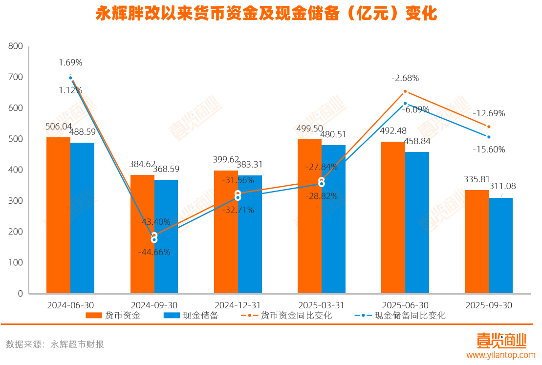 沉重的闭店负担,叠加不稳定的经营现金流,正在快速消耗永辉的现金储备。季度报显示,其货币资金从2024年6月的50.60亿元降至2025年9月的33.58亿元,减少17.02亿元,是其近3年来最低水平。期末现金及现金等价物余额也从48.86亿元降至31.11亿元。