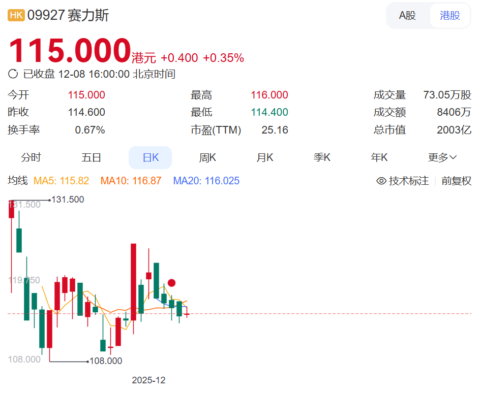 截至12月8日收盘,赛力斯港股每股报价115港元,市值缩水12.5%。