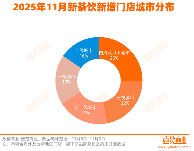 从新增门店的城市分布来看,新茶饮的门店增长重心在下沉市场,其中四线及以下城市11月新增806家门店,占当月新增门店的四分之一;三线城市表现同样强劲,新增693家门店,占比21.72%;二线城市新增占比最少,为15.39%。