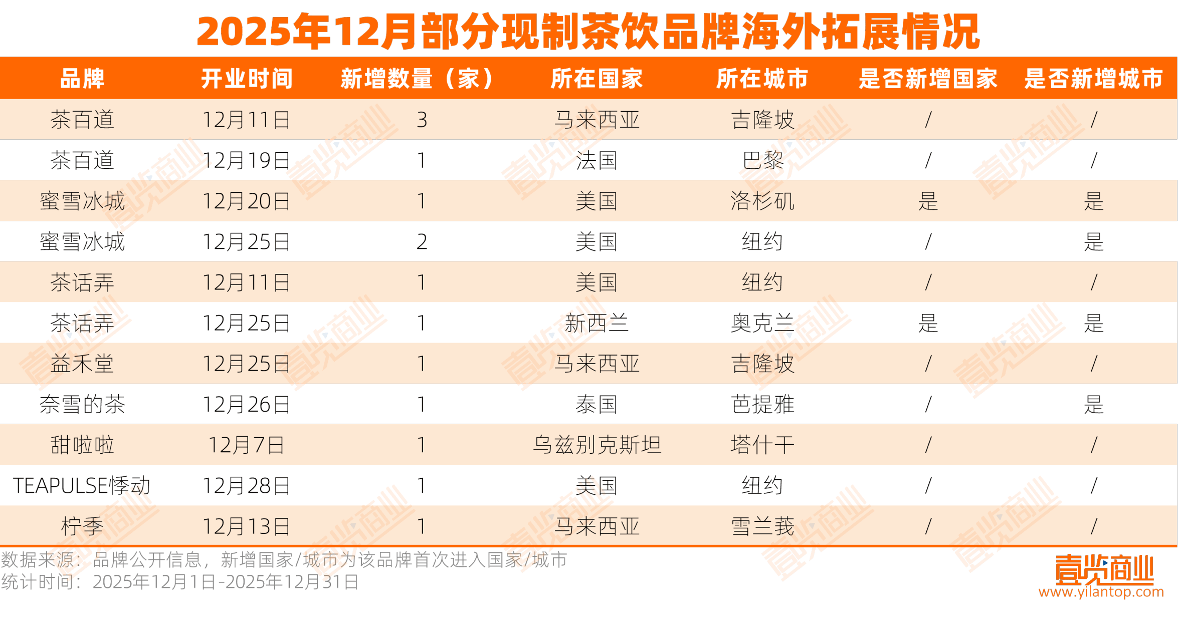 据茶咖观察不完全统计,2025年12月,共有8个茶饮品牌在海外开设了14家新店。