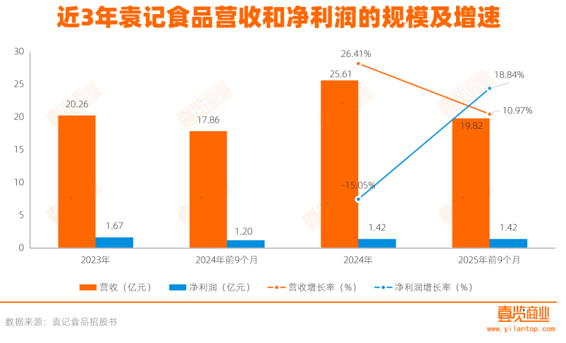 据其招股书,2023年、2024年袁记食品分别实现营业收入20.26亿元、25.61亿元。2025年前九个月营收达19.82亿元,同比增长11%;净利润1.42亿元,同比增长18.84%。截至2025年9月30日,袁记食品已有4266家门店,其中海外门店达53家。