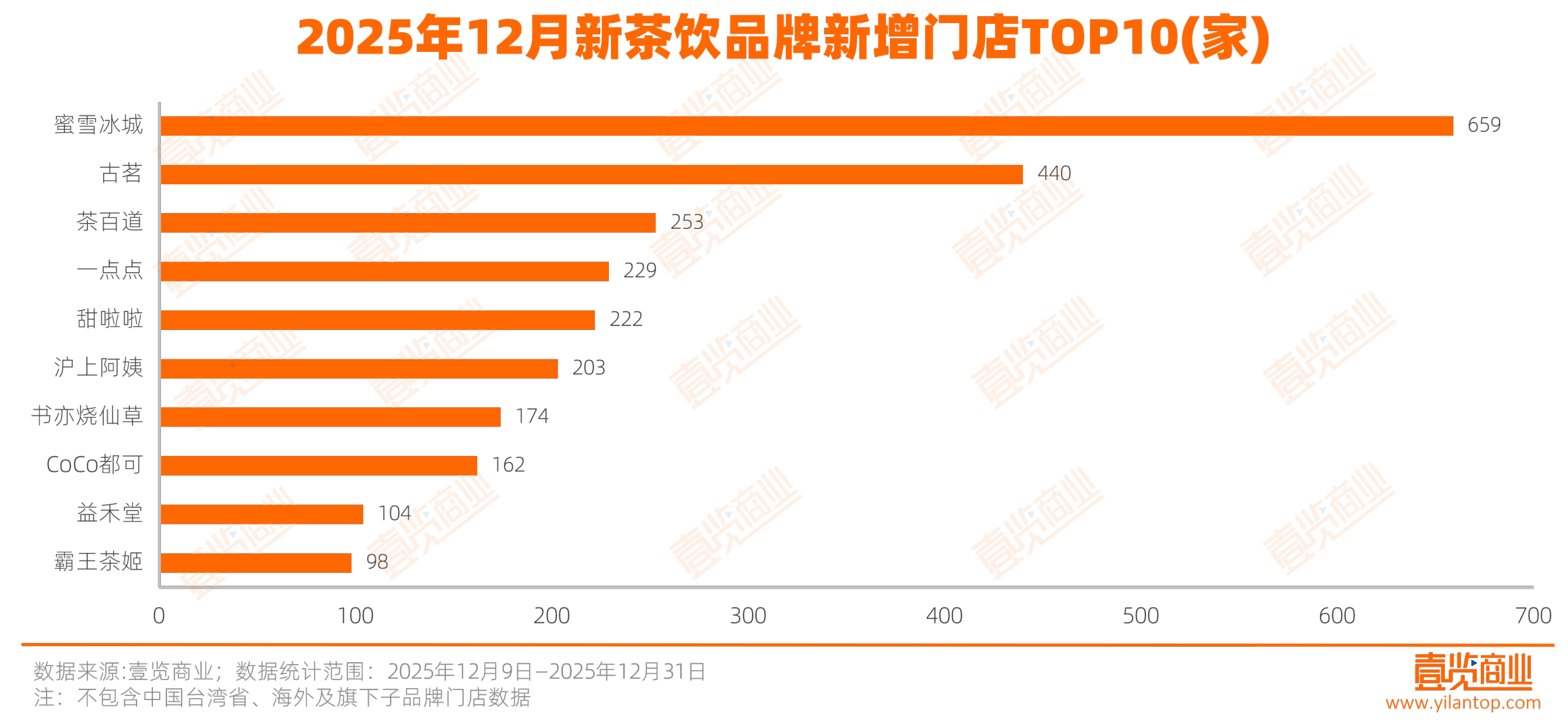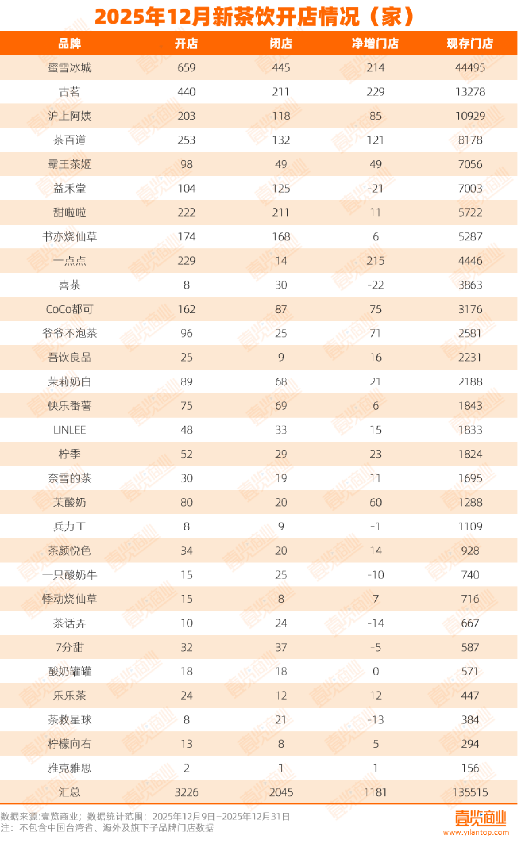 2025年12月,新茶饮门店拓展速度增快。壹览商业监测的30个连锁茶饮品牌合计现有门店总量13.55万家,单月新开3226家、关闭2045家,净增长1181家。