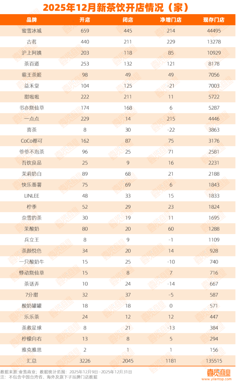 这并非偶发事件。在行业狂飙突进的背景下,此类安全隐患与日俱增。茶咖观察统计,截至2026年1月1日,30个头部连锁茶饮品牌在全国已有13.55万家门店,可比数据显示,2025年净增超1.21万家,同比增加了10.21%,平均每天净增33家门店。