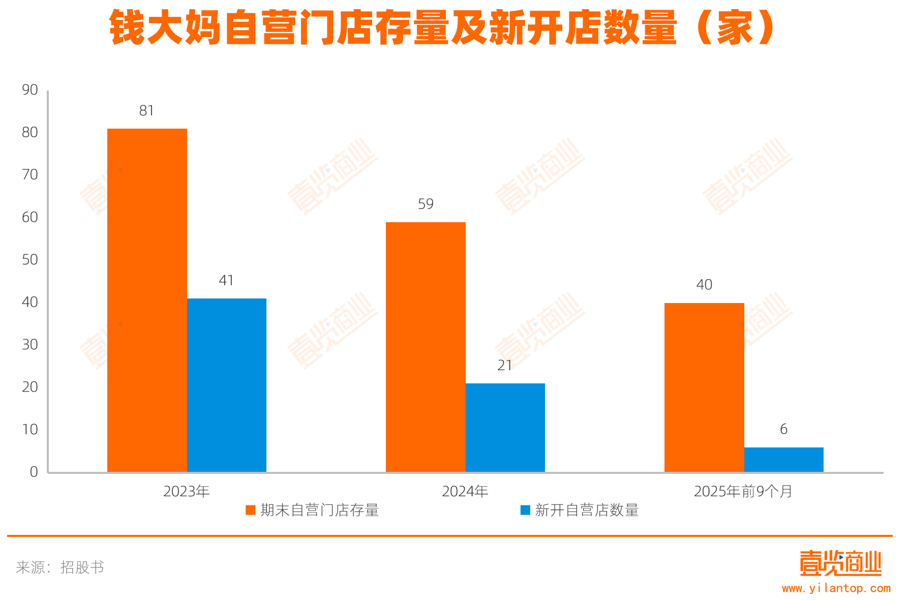 第二,自营业务板块在收缩。门店从2023年末期的81家下滑至2025年前9个月末的40家,减少近一半;新开自营门店数量也在下滑,从2023年的41家下滑至2025年前9个月的6家。