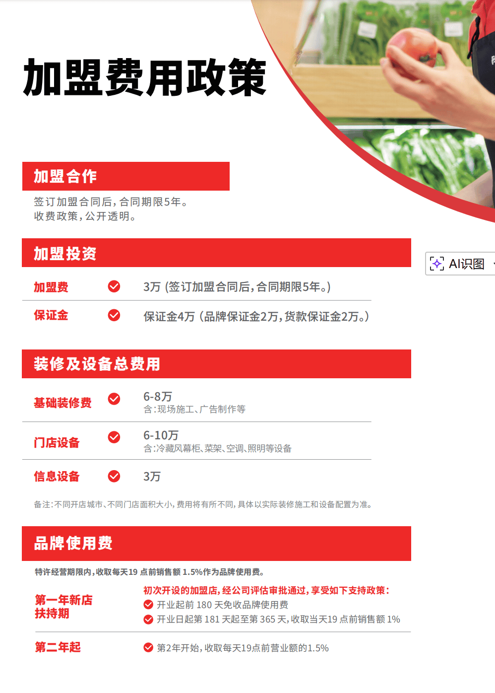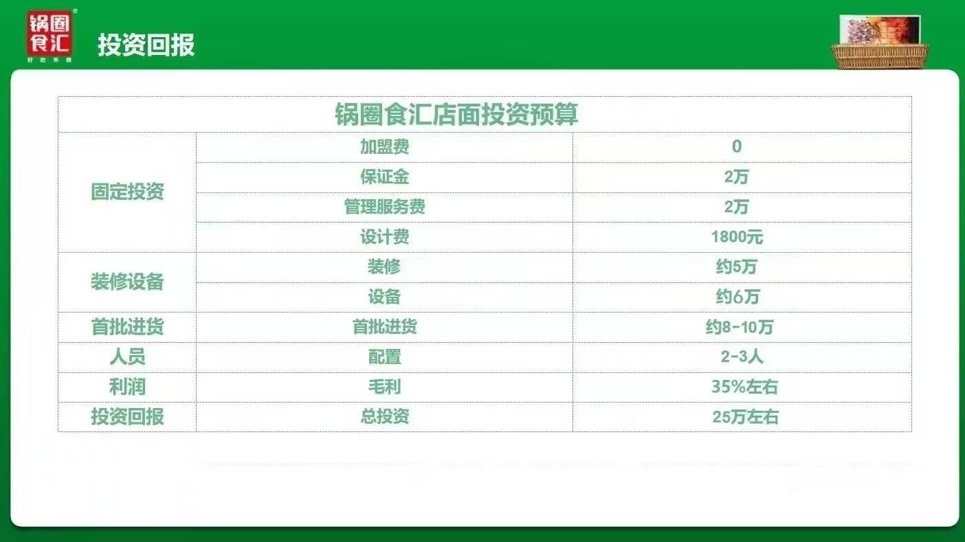 从开店成本看,加盟一家钱大妈,不含房租、人工等,前期需要投资约22万元,加盟第一年的181天起至365天,钱大妈会收取19点前营业额的1%的服务费,第二年开始提高到1.5%;而加盟一家锅圈,不含房租、人工等,前期需要投资约25万元。