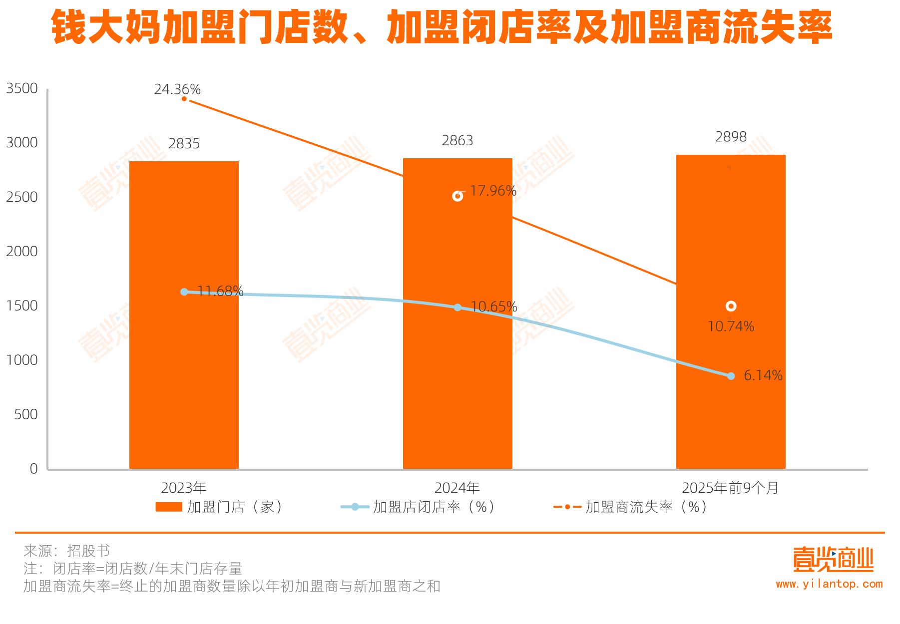 目前,钱大妈加盟店维持在2800家上下,闭店率由2023年的11.68%下滑至2025年的6.14%,加盟商流失率由2023年的24.36%下滑至2025年的10.74%,单个加盟商平均开店数从1.60家微升至1.65家。锅圈的加盟店维持在10000家上下,闭店率与加盟商流失率相关数据未曾披露,无法计算。
