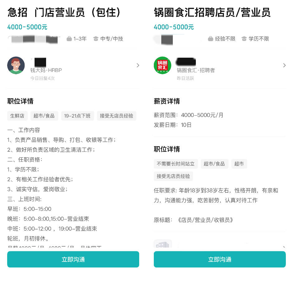 在人工成本方面,在BOSS直聘上,钱大妈店员、锅圈店员的招聘工资分别在5千元、4千元左右,按配备2名员工计算,钱大妈每月需要支付员工工资1万元,锅圈需要支付员工工资8千元。