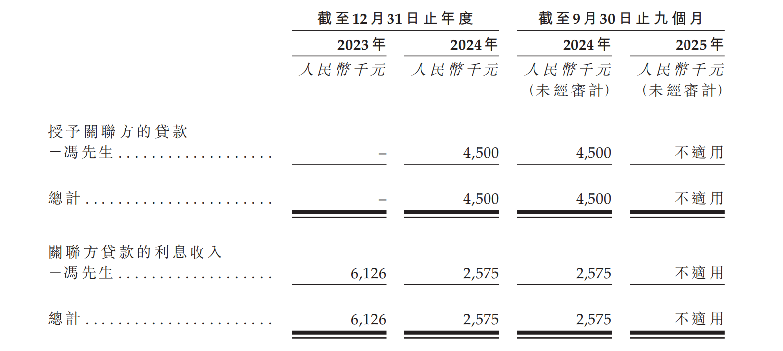 值得关注的是,在此次股权零对价转让前后,冯冀生与钱大妈之间存在多笔大额资金往来。招股书显示,2023年末,钱大妈从冯冀生处获得的贷款利息收入为612.6万元,按照招股书披露的2.4%-5%利率范围估算,冯冀生对钱大妈的借款规模在1.23亿元至2.55亿元之间;同时,钱大妈应收冯冀生借款余额为6997.1万元。2024年,钱大妈又向冯冀生出借450万元,相关利息收入达257.5万元。