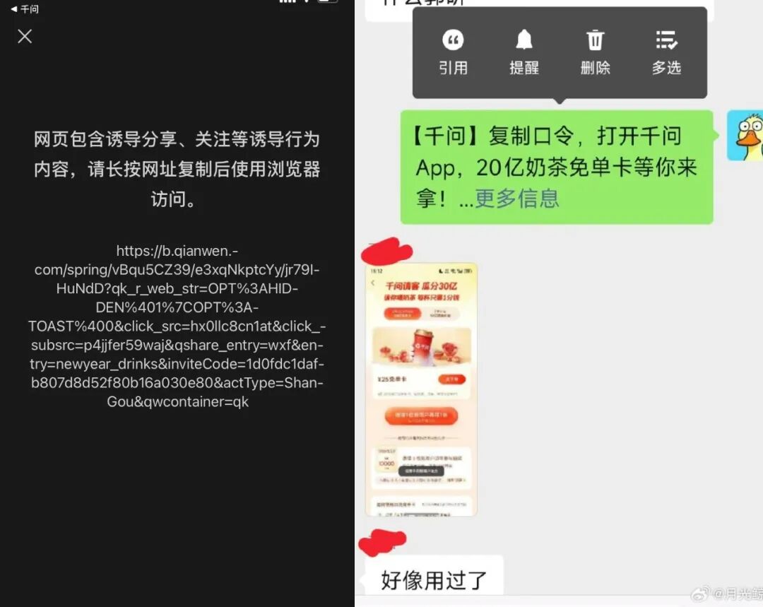 千问的凶猛势头,也引起了腾讯第一时间的严阵以待。早上免单活动刚开始,微信就封禁了千问的分享链接。几小时后,口令分享这一途径也受到了限制,部分用户无法在微信对千问的春节活动口令进行复制。不过,用户随后发现元宝的春节活动分享口令在微信平台也不可复制,真正做到了“一视同仁”。
