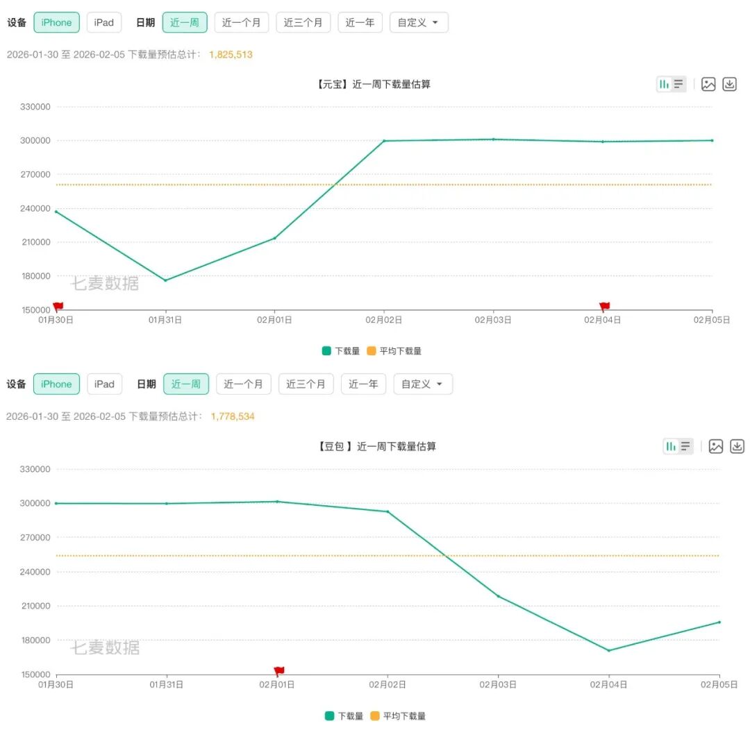 虽然在AppStore应用榜上元宝、千问先后登顶,但豆包都牢牢占据前三名。从七麦数据的下载量预估来看,豆包的用户增长并未受到明显冲击。