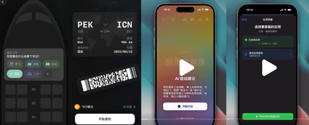 Focus Flight 模拟真实飞行流程(选择航班、值机、飞行模式等),将专注时长可视化为飞行进度;任务结束后提供“机票“纪念与趋势分析;通过全流程场景化,搭配仪式感,巧妙降低用户“难以开始”的畏难情绪。