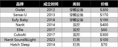 图中所列部分为子品牌产品,故推出时间含公司成立时间和产品推出时间。|穿戴设备品牌中产品线较多,选取相同品类(智能袜子)进行价格比较。Eufy Baby、CuboAi、Ellie(海马爸比)为出海产品