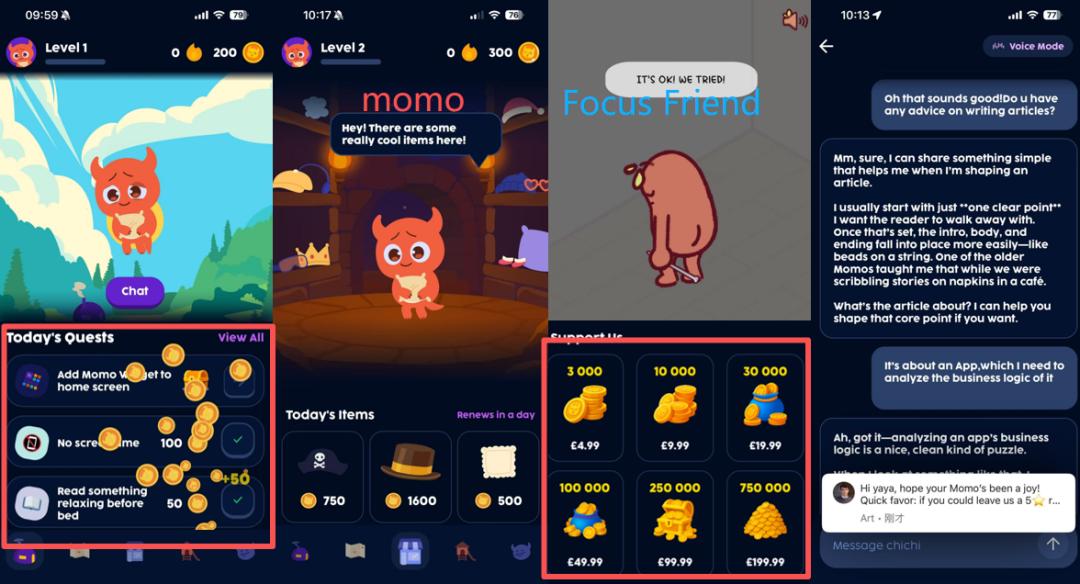 时间来到 2025 年,无论是像 Focus Friend 这样,靠创始人“大网红”背景迅速爆火的“编织豆子”;还是像 Self-Care Pet: Momo 这样,来自异星球、有丰富故事的“八字眉宠物”;驱动专注的核心逻辑都是陪伴与奖励。用户化身“帮助者”,通过专注行为为虚拟角色(豆子、Momo 宠物)换取成长资源(编织物换家具、金币换装饰品)。
