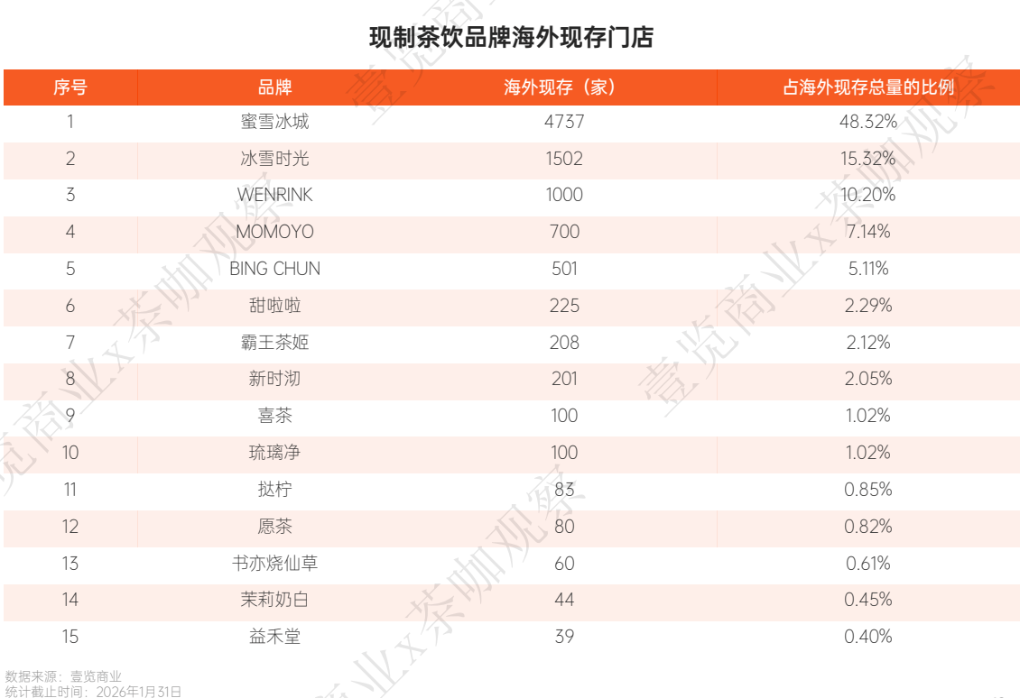 2026年,出海已从“加分项”变为“必选项”。报告详细记录了1月份中国现制茶饮品牌在海外市场的扩张数据以及现存门店数据。东南亚依然是主战场,但欧洲与北美市场正出现新的变量。