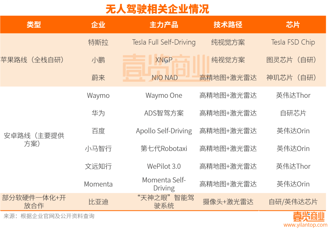除了华为之外,安卓系的企业多采用英伟达提供的自动驾驶芯片平台,并与北汽、上汽、丰田等车企合作,或推出Robotaxi车队,或为车企提供完全自动驾驶技术。